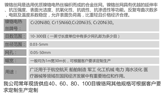 牌号:Cr20Ni80 Cr30Ni70 Cr15Ni60 Cr20Ni35 Cr20Ni30等镍铬合金 材质含量:一般为 2080 3070 1560 2035等 镍铬网具有电阻温度系数低、电阻率高、与铜接触热电动势小、电阻稳定、良好的力学性能、抗氧化性能、抗蚀性能 用途:工业用电炉、石油、化工、制药、电子元器件烧结、国防、航空航天等